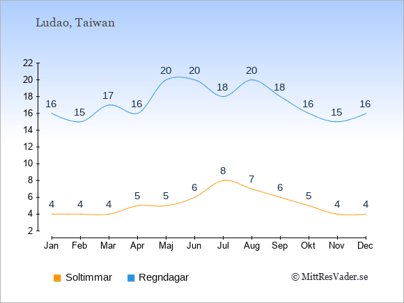 Grafen visar det genomsnittliga antalet soltimmar på Ludao under en viss månad (soltimmar är det antalet timmar per dag där solen skinnar), och antalet regndagar (dvs. det genomsnittliga antalet dagar