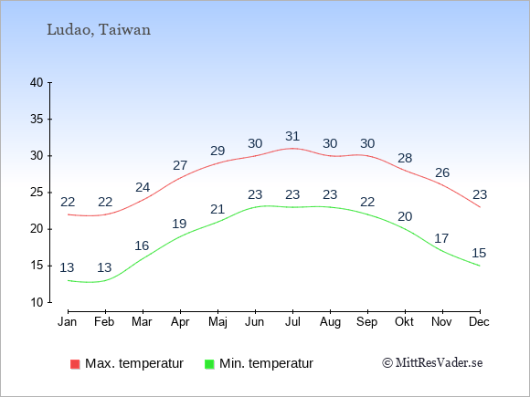 Grafen visar de genomsnittligt högsta temperaturerna på Ludao (vanligtvis det värde som uppmätts mitt på dagen) och de genomsnittligt lägsta temperaturer (vanligtvis tidpunkten just innan soluppgång).