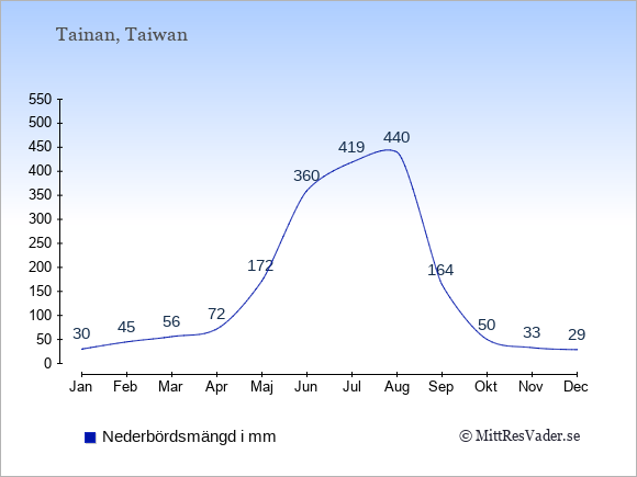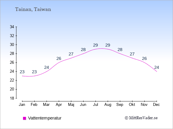 För att se hur vädret i Tainan skiljer sig från vädret hemma, kan du också jämföra siffrorna måned för måned med motsvarande siffror för Sverige under samma period här: Tainans klimat.