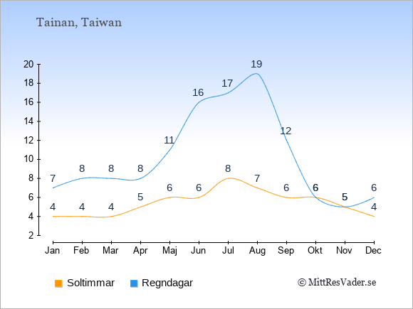 Grafen visar det genomsnittliga antalet soltimmar i Tainan under en viss månad (soltimmar är det antalet timmar per dag där solen skinnar), och antalet regndagar (dvs. det genomsnittliga antalet dagar