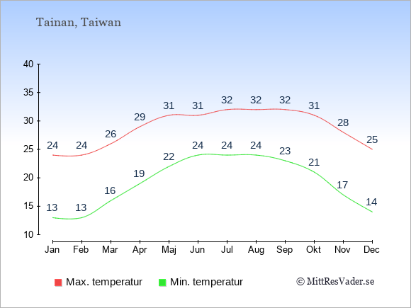 Grafen visar de genomsnittligt högsta temperaturerna i Tainan (vanligtvis det värde som uppmätts mitt på dagen) och de genomsnittligt lägsta temperaturer (vanligtvis tidpunkten just innan soluppgång).