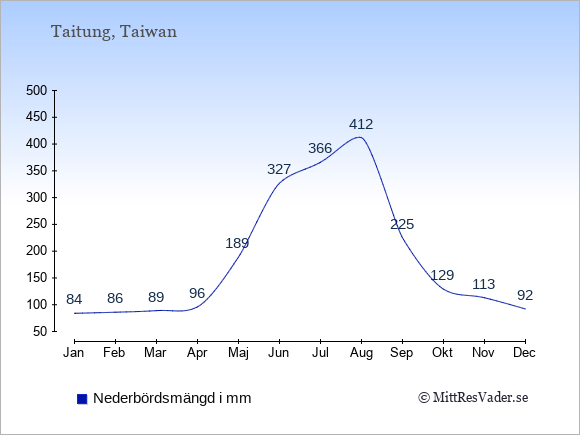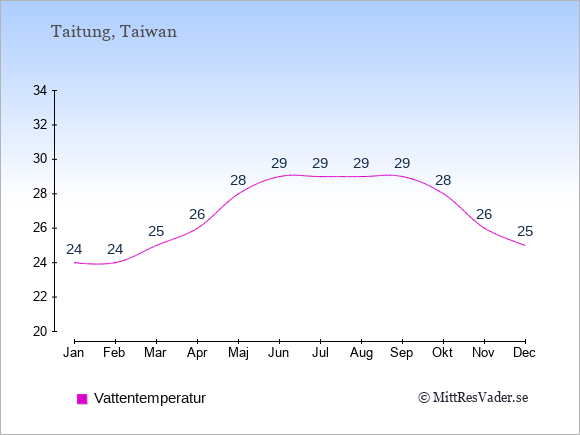 För att se hur vädret i Taitung skiljer sig från vädret hemma, kan du också jämföra siffrorna måned för måned med motsvarande siffror för Sverige under samma period här: Taitungs klimat.