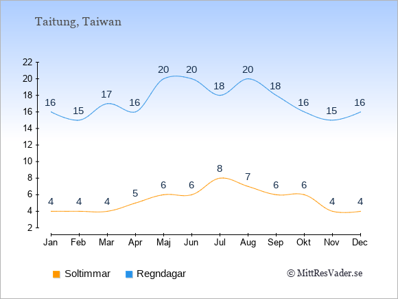 Väder i Taitung: Soltimmar och regndagar