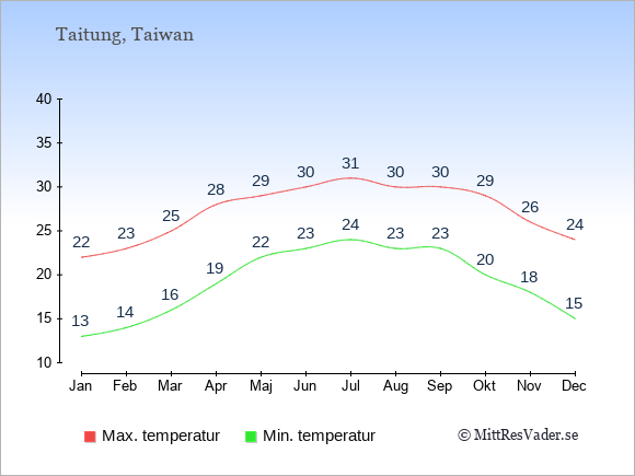 Grafen visar de genomsnittligt högsta temperaturerna i Taitung (vanligtvis det värde som uppmätts mitt på dagen) och de genomsnittligt lägsta temperaturer (vanligtvis tidpunkten just innan soluppgång).