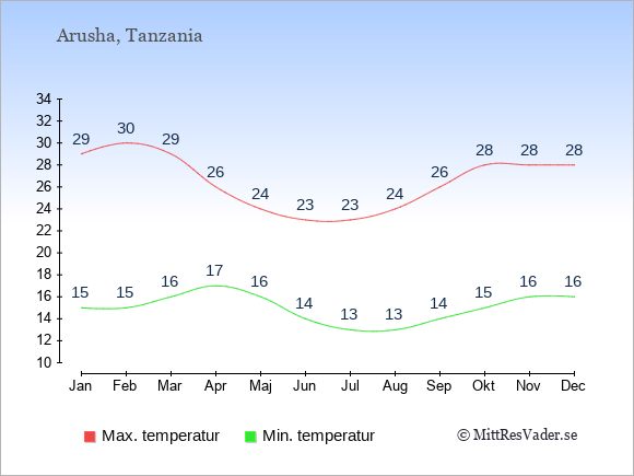 Grafen visar de genomsnittligt högsta temperaturerna i Arusha (vanligtvis det värde som uppmätts mitt på dagen) och de genomsnittligt lägsta temperaturer (vanligtvis tidpunkten just innan soluppgång).