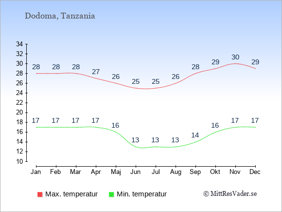 Grafen visar de genomsnittligt högsta temperaturerna i Dodoma (vanligtvis det värde som uppmätts mitt på dagen) och de genomsnittligt lägsta temperaturer (vanligtvis tidpunkten just innan soluppgång).