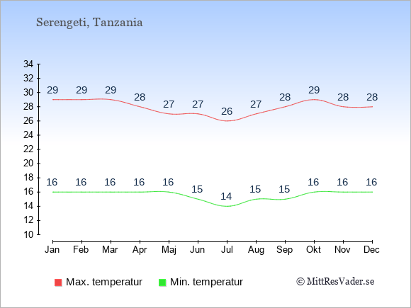 Grafen visar de genomsnittligt högsta temperaturerna i Serengeti (vanligtvis det värde som uppmätts mitt på dagen) och de genomsnittligt lägsta temperaturer (vanligtvis tidpunkten just innan soluppgång).