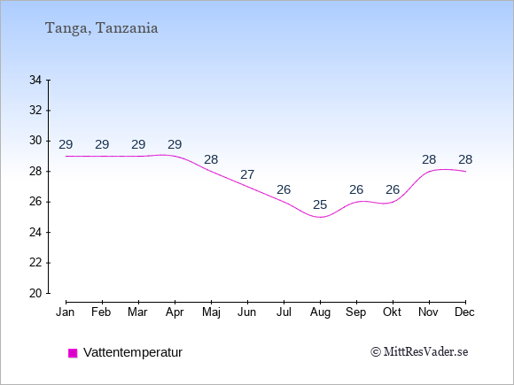 Grafen visar de genomsnittligt högsta temperaturerna i Tanga (vanligtvis det värde som uppmätts mitt på dagen) och de genomsnittligt lägsta temperaturer (vanligtvis tidpunkten just innan soluppgång).