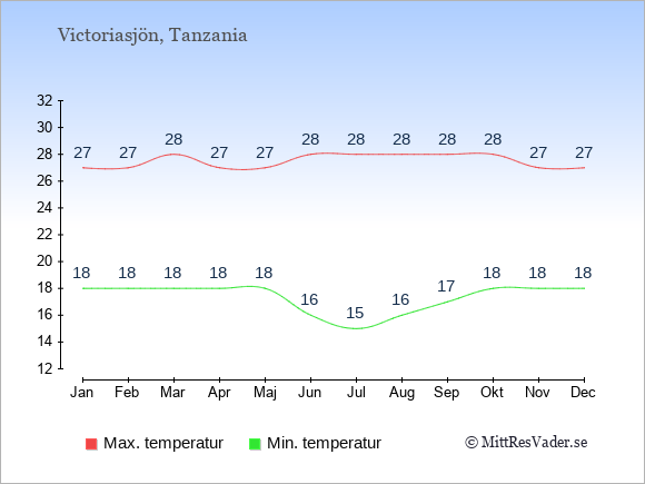 Grafen visar de genomsnittligt högsta temperaturerna vid Victoriasjön (vanligtvis det värde som uppmätts mitt på dagen) och de genomsnittligt lägsta temperaturer (vanligtvis tidpunkten just innan soluppgång).