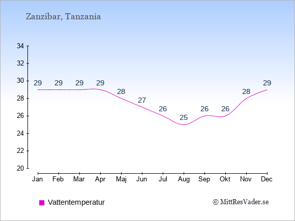 Grafen visar de genomsnittligt högsta temperaturerna i Zanzibar (vanligtvis det värde som uppmätts mitt på dagen) och de genomsnittligt lägsta temperaturer (vanligtvis tidpunkten just innan soluppgång).