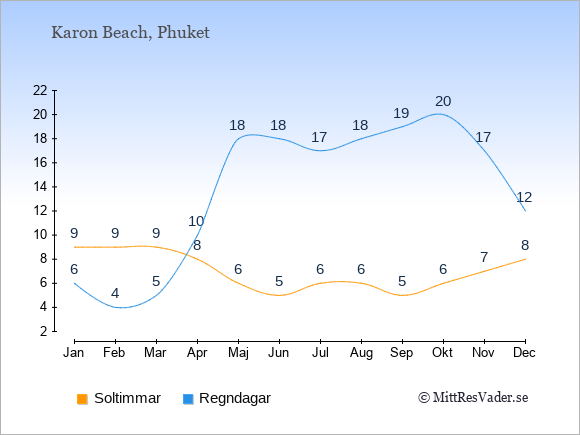 Graferna visar det genomsnittliga antalet soltimmar i Karon Beach per dag