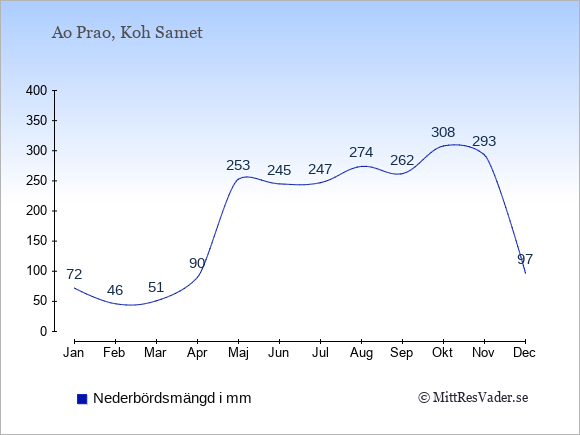 För att se hur vädret i Ao Prao skiljer sig från vädret hemma, kan du också jämföra siffrorna måned för måned med motsvarande siffror för Sverige under samma period här: Ao Praos klimat.