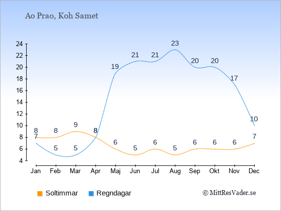 Grafen visar det genomsnittliga antalet soltimmar i Ao Prao under en viss månad (soltimmar är det antalet timmar per dag där solen skinnar), och antalet regndagar (dvs. det genomsnittliga antalet dagar