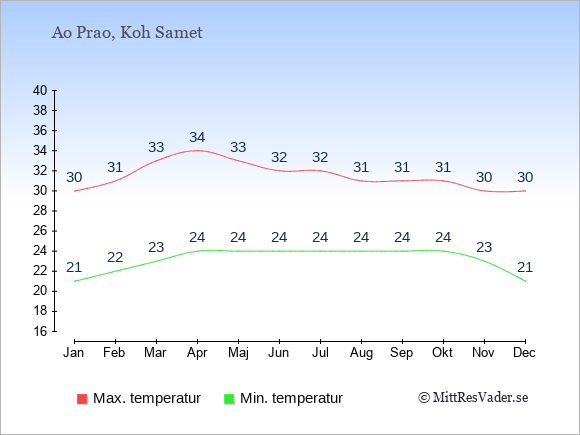 Grafen visar de genomsnittligt högsta temperaturerna i Ao Prao (vanligtvis det värde som uppmätts mitt på dagen) och de genomsnittligt lägsta temperaturer (vanligtvis tidpunkten just innan soluppgång).