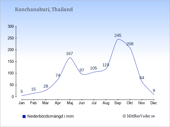 För att se hur vädret i Kanchanaburi skiljer sig från vädret hemma, kan du också jämföra siffrorna måned för måned med motsvarande siffror för Sverige under samma period här: Kanchanaburis klimat.