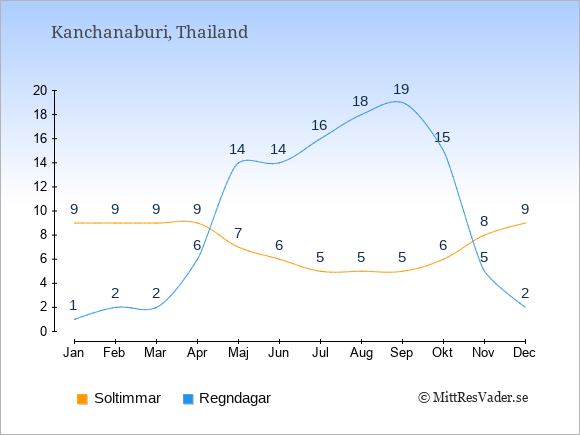 Grafen visar det genomsnittliga antalet soltimmar i Kanchanaburi under en viss månad (soltimmar är det antalet timmar per dag där solen skinnar), och antalet regndagar (dvs. det genomsnittliga antalet dagar