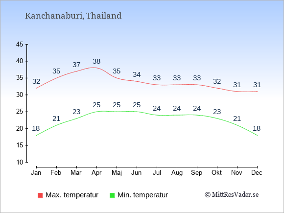 Grafen visar de genomsnittligt högsta temperaturerna i Kanchanaburi (vanligtvis det värde som uppmätts mitt på dagen) och de genomsnittligt lägsta temperaturer (vanligtvis tidpunkten just innan soluppgång).