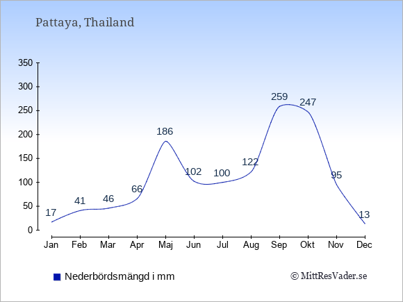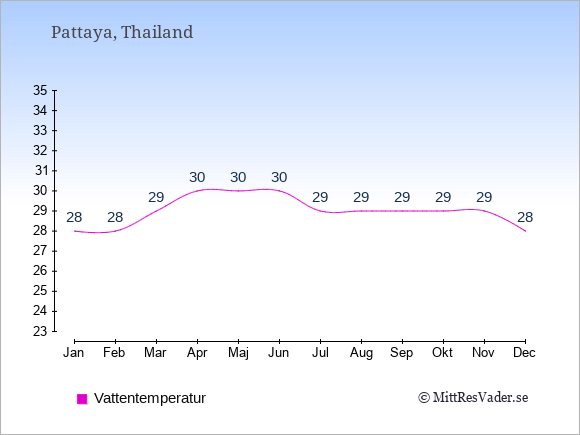 För att se hur vädret i Pattaya skiljer sig från vädret hemma, kan du också jämföra siffrorna måned för måned med motsvarande siffror för Sverige under samma period här: Pattayas klimat.