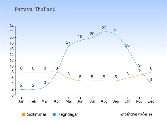 Grafen visar det genomsnittliga antalet soltimmar i Pattaya under en viss månad (soltimmar är det antalet timmar per dag där solen skinnar), och antalet regndagar (dvs. det genomsnittliga antalet dagar