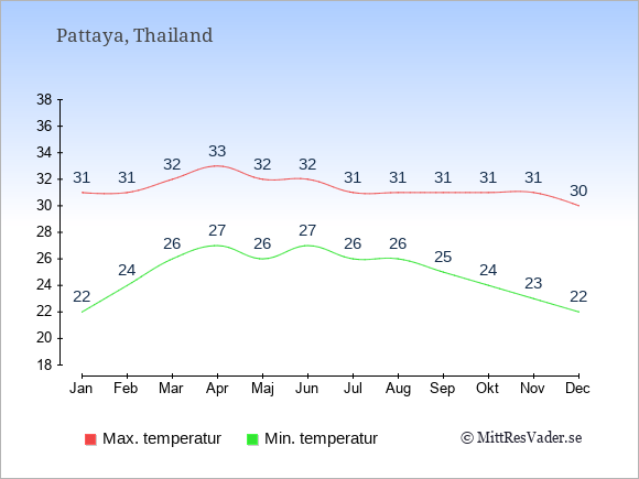 Grafen visar de genomsnittligt högsta temperaturerna i Pattaya (vanligtvis det värde som uppmätts mitt på dagen) och de genomsnittligt lägsta temperaturer (vanligtvis tidpunkten just innan soluppgång).