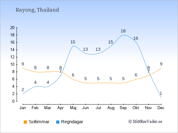 Grafen visar det genomsnittliga antalet soltimmar i Rayong under en viss månad (soltimmar är det antalet timmar per dag där solen skinnar), och antalet regndagar (dvs. det genomsnittliga antalet dagar