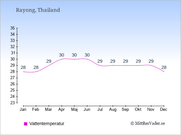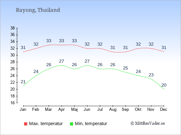 Grafen visar de genomsnittligt högsta temperaturerna i Rayong (vanligtvis det värde som uppmätts mitt på dagen) och de genomsnittligt lägsta temperaturer (vanligtvis tidpunkten just innan soluppgång).