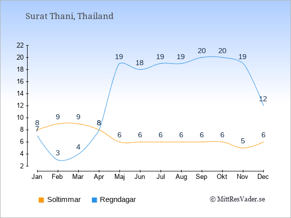 Grafen visar det genomsnittliga antalet soltimmar i Surat Thani under en viss månad (soltimmar är det antalet timmar per dag där solen skinnar), och antalet regndagar (dvs. det genomsnittliga antalet dagar