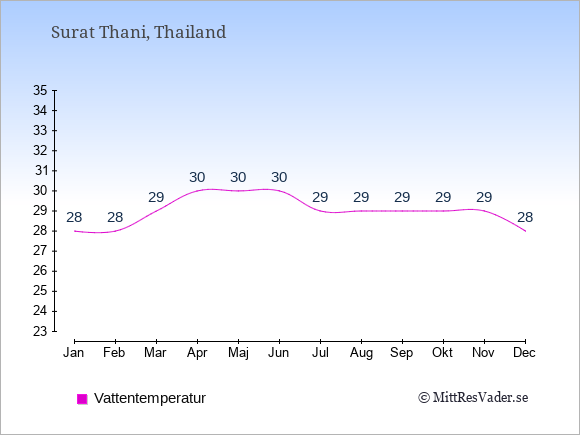 Grafen visar de genomsnittligt högsta temperaturerna i Surat Thani (vanligtvis det värde som uppmätts mitt på dagen) och de genomsnittligt lägsta temperaturer (vanligtvis tidpunkten just innan soluppgång).