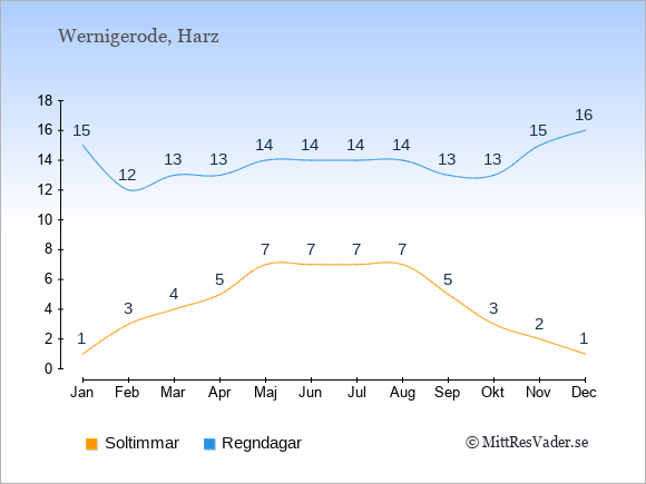 Ska man ut och resa, har Wernigerode det bästa klimatet i de månader, där det finns många soltimmar og få regndagar.