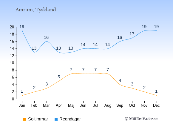 Grafen visar det genomsnittliga antalet soltimmar på Amrum under en viss månad (soltimmar är det antalet timmar per dag där solen skinnar), och antalet regndagar (dvs. det genomsnittliga antalet dagar