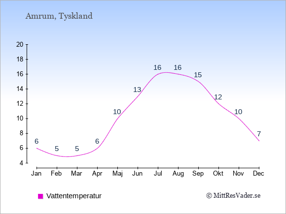 Grafen visar de genomsnittligt högsta temperaturerna på Amrum (vanligtvis det värde som uppmätts mitt på dagen) och de genomsnittligt lägsta temperaturer (vanligtvis tidpunkten just innan soluppgång).