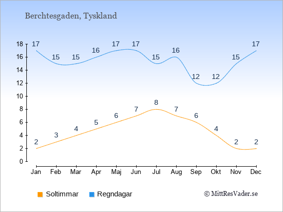 Grafen visar det genomsnittliga antalet soltimmar i Berchtesgaden under en viss månad (soltimmar är det antalet timmar per dag där solen skinnar), och antalet regndagar (dvs. det genomsnittliga antalet dagar
