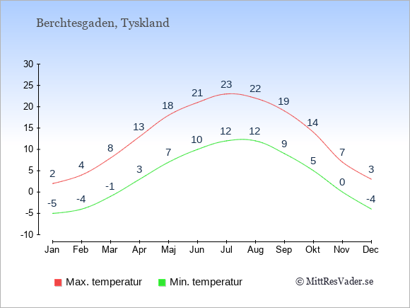 Grafen visar de genomsnittligt högsta temperaturerna i Berchtesgaden (vanligtvis det värde som uppmätts mitt på dagen) och de genomsnittligt lägsta temperaturer (vanligtvis tidpunkten just innan soluppgång).