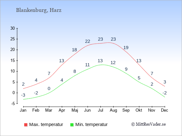 Grafen visar de genomsnittligt högsta temperaturerna i Blankenburg (vanligtvis det värde som uppmätts mitt på dagen) och de genomsnittligt lägsta temperaturer (vanligtvis tidpunkten just innan soluppgång).