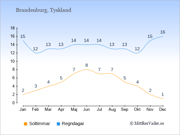 Grafen visar det genomsnittliga antalet soltimmar i Brandenburg under en viss månad (soltimmar är det antalet timmar per dag där solen skinnar), och antalet regndagar (dvs. det genomsnittliga antalet dagar