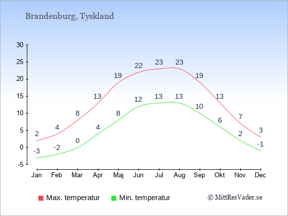 Grafen visar de genomsnittligt högsta temperaturerna i Brandenburg (vanligtvis det värde som uppmätts mitt på dagen) och de genomsnittligt lägsta temperaturer (vanligtvis tidpunkten just innan soluppgång).