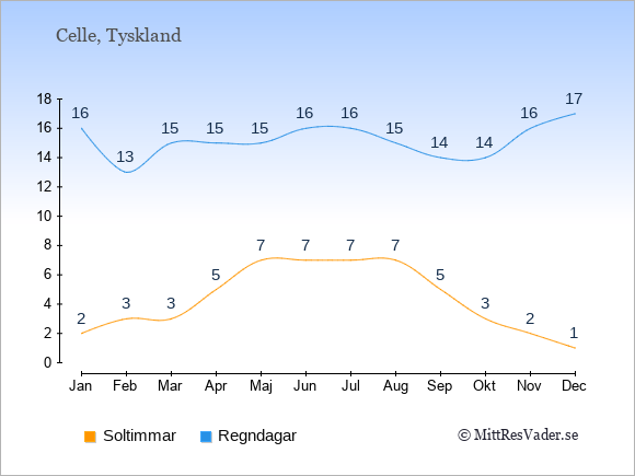 Grafen visar det genomsnittliga antalet soltimmar i Celle under en viss månad (soltimmar är det antalet timmar per dag där solen skinnar), och antalet regndagar (dvs. det genomsnittliga antalet dagar