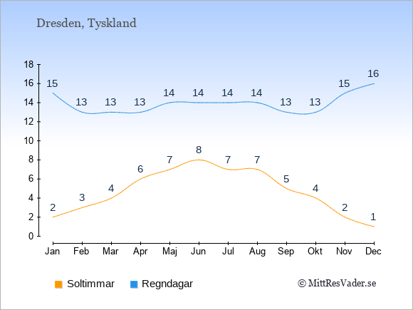 Grafen visar det genomsnittliga antalet soltimmar i Dresden under en viss månad (soltimmar är det antalet timmar per dag där solen skinnar), och antalet regndagar (dvs. det genomsnittliga antalet dagar