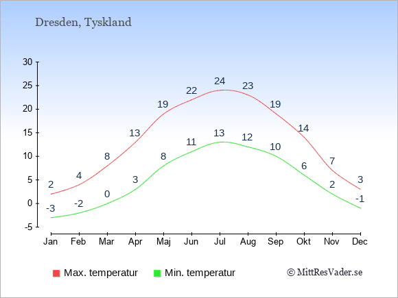 Grafen visar de genomsnittligt högsta temperaturerna i Dresden (vanligtvis det värde som uppmätts mitt på dagen) och de genomsnittligt lägsta temperaturer (vanligtvis tidpunkten just innan soluppgång).