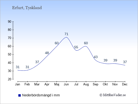 För att se hur vädret i Erfurt skiljer sig från vädret hemma, kan du också jämföra siffrorna måned för måned med motsvarande siffror för Sverige under samma period här: Erfurts klimat.