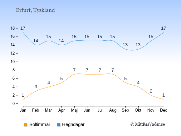 Grafen visar det genomsnittliga antalet soltimmar i Erfurt under en viss månad (soltimmar är det antalet timmar per dag där solen skinnar), och antalet regndagar (dvs. det genomsnittliga antalet dagar