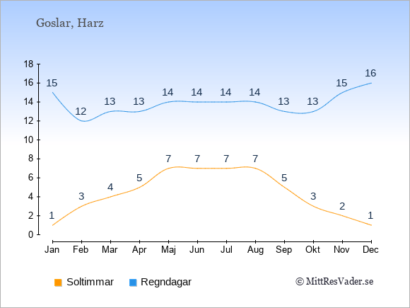 Grafen visar det genomsnittliga antalet soltimmar i Goslar under en viss månad (soltimmar är det antalet timmar per dag där solen skinnar), och antalet regndagar (dvs. det genomsnittliga antalet dagar