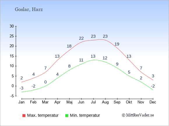 Grafen visar de genomsnittligt högsta temperaturerna i Goslar (vanligtvis det värde som uppmätts mitt på dagen) och de genomsnittligt lägsta temperaturer (vanligtvis tidpunkten just innan soluppgång).