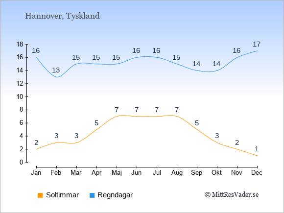Grafen visar det genomsnittliga antalet soltimmar i Hannover under en viss månad (soltimmar är det antalet timmar per dag där solen skinnar), och antalet regndagar (dvs. det genomsnittliga antalet dagar