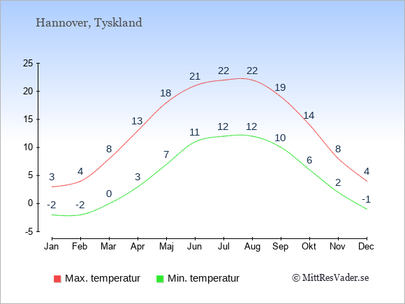 Grafen visar de genomsnittligt högsta temperaturerna i Hannover (vanligtvis det värde som uppmätts mitt på dagen) och de genomsnittligt lägsta temperaturer (vanligtvis tidpunkten just innan soluppgång).