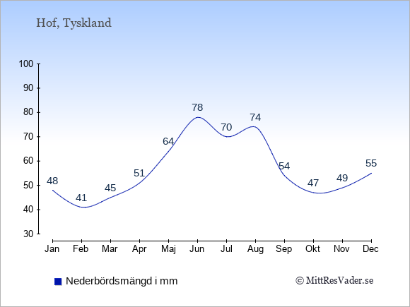 För att se hur vädret i Hof skiljer sig från vädret hemma, kan du också jämföra siffrorna måned för måned med motsvarande siffror för Sverige under samma period här: Hofs klimat.