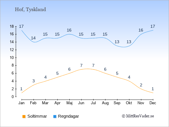 Grafen visar det genomsnittliga antalet soltimmar i Hof under en viss månad (soltimmar är det antalet timmar per dag där solen skinnar), och antalet regndagar (dvs. det genomsnittliga antalet dagar