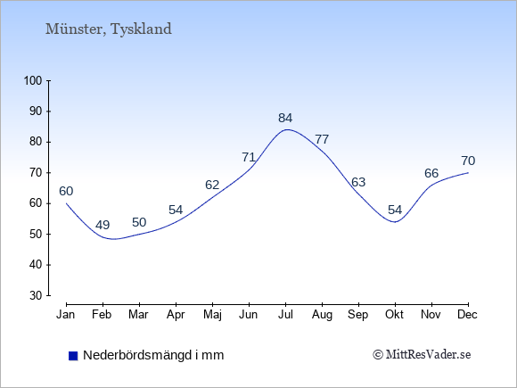 För att se hur vädret i Münster skiljer sig från vädret hemma, kan du också jämföra siffrorna måned för måned med motsvarande siffror för Sverige under samma period här: Münsters klimat.