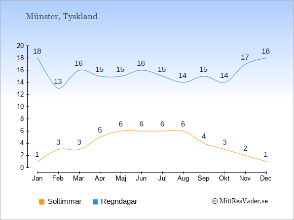Grafen visar det genomsnittliga antalet soltimmar i Münster under en viss månad (soltimmar är det antalet timmar per dag där solen skinnar), och antalet regndagar (dvs. det genomsnittliga antalet dagar