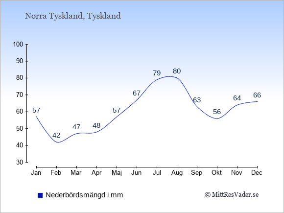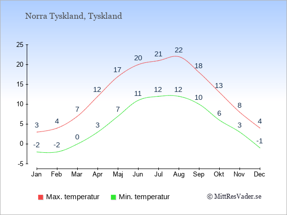 För att se hur vädret i Norra Tyskland skiljer sig från vädret hemma, kan du också jämföra siffrorna måned för måned med motsvarande siffror för Sverige under samma period här: Norra Tysklands klimat.
